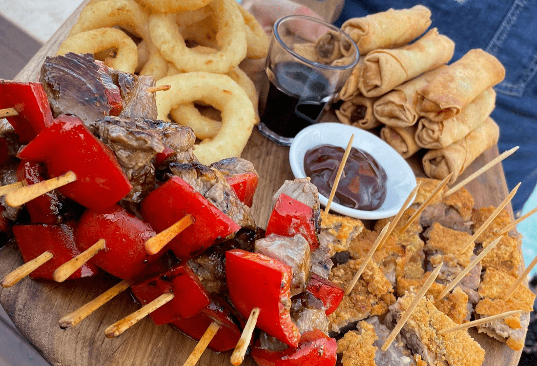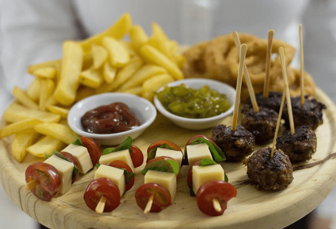 • Tablas: Arrollados primavera, Aros de cebolla, Papas rústicas, Nachos, Milanesa crocante, Brochetas de carne, Salsas ( guacamole, sala soja, barbacoa